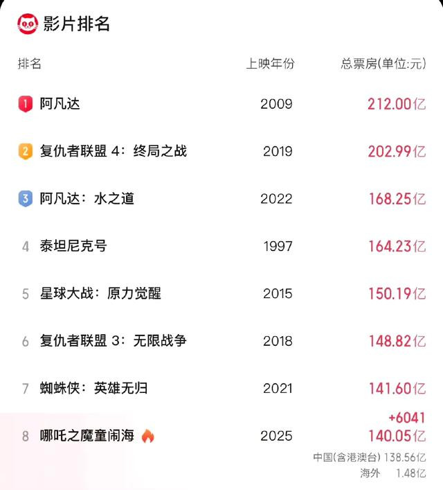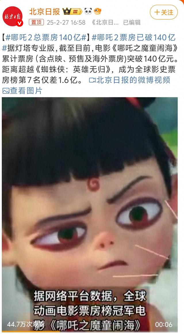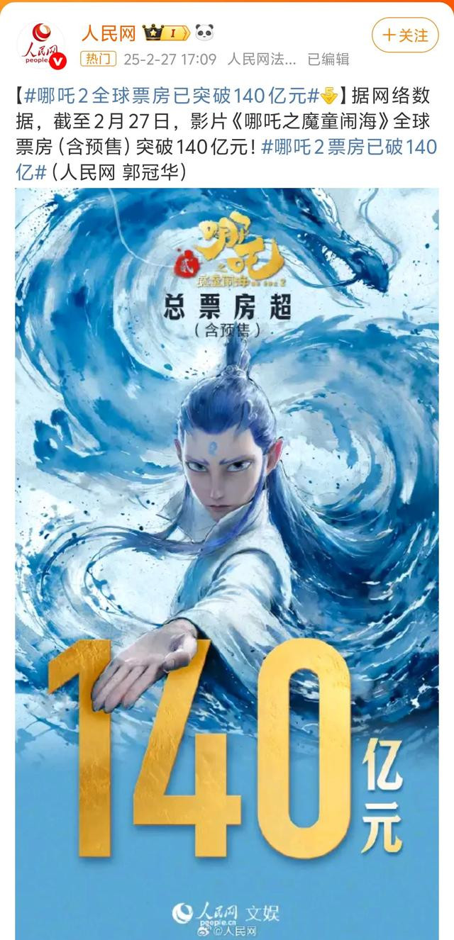 特大好消息!《哪吒之魔童闹海》总票房破140亿元啦!可喜可贺,距离冲进全球票房榜第七名还差1.6亿!无论单日票房变化再大,也不影响《哪吒2》一直破亿破纪录啊,谁又爽到了?就是我呀